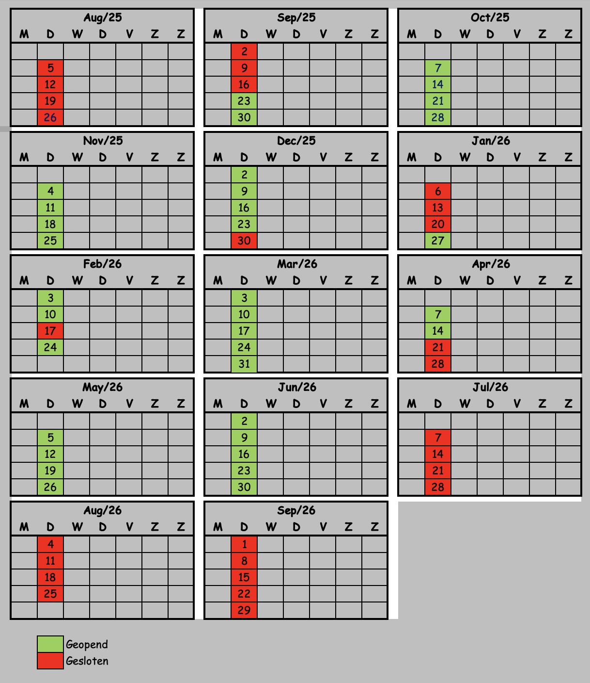 - Meivakantie : 21 en 28 april 2026 (let op!! 2 weken meivakantie)